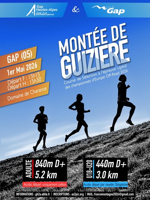 INSCRIPTIONS trail des contreforts du piolitla batie neuve (05) 12 avril 2026 INSCRIPTIONS championnats de france de 24 heurestullins (38) 11 & 12 avril 2026 INSCRIPTIONS la bombarde et la montée d’ouleVeynes (05) 25 & 26 avril 2026 INSCRIPTIONS montée de GuizièreGAP (05) 1er mai 2026 INSCRIPTIONS CHAMPIONNATS DE FRANCECOURSE EN MONTAGNEGAP (05) 3 mai 2026 INSCRIPTIONS CHAMPIONNATS DE FRANCE INSCRIPTIONS COURSES OPEN trail de la haute-durancel’argentière la bessée (05) 9 & 10 mai 2026 INSCRIPTIONS la foulée caturigechorges (05) 17 mai 2026 INSCRIPTIONS De la Plaine aux sommetsancelle (05) 30 mai 2026 INSCRIPTIONS wild trail réallon (05) 14 juin 2026 INSCRIPTIONS trail du col du noyerLaye (05) 20 & 21 juin 2026 INSCRIPTIONS grand trail des ecrinsvallouise – pelvoux (05) 20 juin 2026 INSCRIPTIONS Altitude 1664Saint-lien en champsaur (05) 28 juin 2026 INSCRIPTIONS Ultrachampsaurpont-du-fossé (05) 4 juillet 2026 INSCRIPTIONS RAID VTT L’ETERLOULE Dévoluy (05) 4 & 5 juillet 2026 INSCRIPTIONS SKYRACE DE MONTGENEVRE (05) 11 & 12 juillet 2026 INSCRIPTIONS orcières mtb games Orcières-Merlette 1850 (05) 11 & 12 juillet 2026 INSCRIPTIONS UTOBISaint-Disdier en dévoluy (05) 25 juillet 2026 INSCRIPTIONS les trails des lacs d’orcières (05) 1er et 2 août 2026 INSCRIPTIONS SKYRACELES ORRES (05) 8 août 2026 INSCRIPTIONS trail des balcons de chateauvieux (05) 23 août 2026 INSCRIPTIONS la grande tracele devoluy (05) 29 & 30 août 2026 INSCRIPTIONS le Grand trail de Serre-Ponçonembrun (05) 19 & 20 septembre 2026 INSCRIPTIONS Gapen’Cimesgap (05) 3 & 4 octobre 2026 INSCRIPTIONS